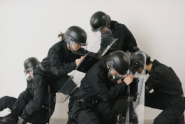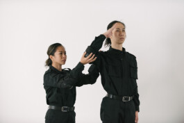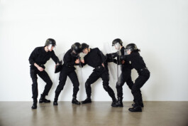 Konflikt unter der Lupe: Isaac Chong Wais Werk Rehearsal of the Futures: Police Training Exercises nimmt politische Protestbewegungen und ihre wiederkehrenden Elemente in den Blick. Die Zwei-Kanal-Videoinstallation zeigt Reenactments von Polizeiübungen in reduzierter Geschwindigkeit - eine Slow-Motion Nahaufnahme von Techniken polizeilicher Praxis in Demonstrationen. Abstrahiert durch die isolierte und verlangsamte Ausübung der Bewegungen von fünf Performer*innen ermöglicht Chong distanzierte Perspektiven auf die Themenkomplexe Gewalt, Macht und Protest.